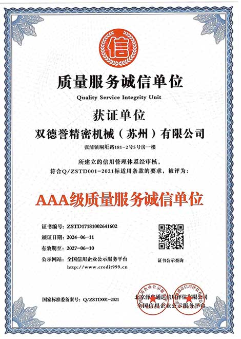 質(zhì)量服務(wù)誠(chéng)信單位-雙德譽(yù)精密機(jī)械(蘇州)有限公司